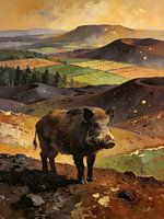 Earthbound Calm legt een rustig moment van kracht en aanwezigheid vast in het glooiende landschap van de Eifel. Een wild zwijn staat stevig en stil, niet afgebeeld als woest of indrukwekkend, maar als diep verbonden met het land waar het leeft. Het omringende terrein ontvouwt zich zachtjes in gelaagde aardetinten, gedempte groentinten…