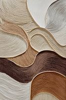 spel van golvende lijnen en tactiele verfstructuren, opgebouwd uit een palet van natuurlijke aardetinten zoals crème, beige, zand, karamel en diepbruin. De compositie bestaat uit organische vormen die zich in elkaar vlechten, bijna als aardlagen of zandduinen, met een opmerkelijke aandacht voor ritme en beweging.