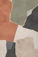 Abstracte compositie, waarbij verschillend gevormde vlakken in harmonie naast en over elkaar zijn geplaatst. De kleurenpalet is aards en zacht, met tinten die variëren van terracotta tot olijfgroen, donkergrijs en verschillende beigetinten.