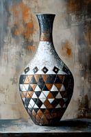 Een viering van Afrikaanse kunstzinnigheid, dit schilderij toont een prachtig bewerkte vaas. De ingewikkelde patronen en het warme kleurenpalet roepen een gevoel van warmte en traditie op. Deze aarden vazen herinneren aan de blijvende schoonheid van handgemaakte voorwerpen en het rijke culturele erfgoed waaruit ze voortkomen.