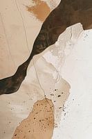 abstracte compositie die speelt met aardse kleuren en organische vormen. Het palet omvat beige, wit en verschillende tinten bruin, waardoor een gevoel van warmte en rust ontstaat. De vloeiende lijnen en scheuren die door het beeld lopen, suggereren natuurlijke bewegingen zoals rivierstromen of de erosie van landschappen. De combinatie van gladde vlakken en ruwe texturen creëert een interessante dynamiek, waarin leegte en detail elkaar aanvullen.