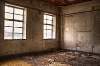 Een foto van een vervallen en verlaten oude kamer in een fabriekshal te Amsterdam. Met kapotte ramen, scherven op de vloer en kapotte leidingen.