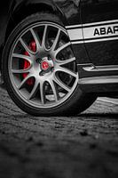 Zwart-wit foto van de velg met remklauw van een Abarth 595 (Fiat 500). De Brembo remklauw en de schorpioen zijn in rood uitgevoerd om te accentueren. Verder een eenvoudig veelzeggend beeld.