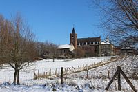 Besneeuwd Vlaams landschap, met zicht op de abdij van Affligem, vanaf een landelijk voetpad in Vlaanderen. Historisch herkenningspunt België in de winter.