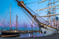 Bataviahaven Lelystad tijdens het blauwe uur met volle maan.
