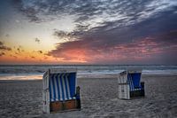 leere Strandkörbe am Abend bei Sonnenuntergang am westlichen Strand der Insel Sylt in der Nordsee