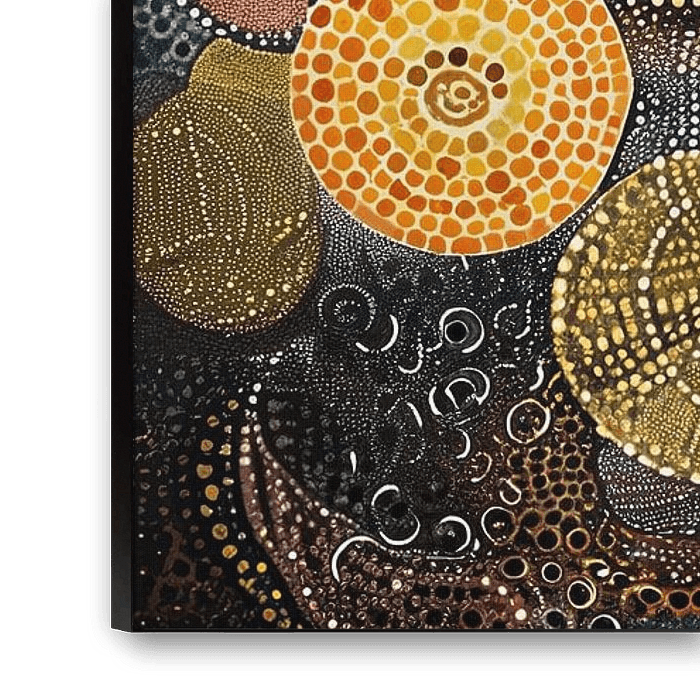 Aboriginal Dot Art - Dit canvas is een fascinerend spel van stippen en cirkels dat je doet denken aan de levendige tradities van de Aboriginal dot painting. De organisch geplaatste vormen en het gebruik van aardse kleuren verweven met accenten van blauw en oranje creëren een harmonieus geheel dat zowel rust als dynamiek uitstraalt, perfect voor een hedendaags interieur met een etnische toets.