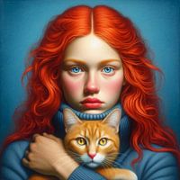 Dit is een betoverend en sprekend portret van een vrouw met opvallend rood, golvend haar en helderblauwe ogen, die op een serene manier een oranje cyperse kat in haar armen houdt. De vrouw draagt een blauwe coltrui die perfect aansluit bij de achtergrond, waardoor de focus volledig op de gezichten en de intense kleuren ligt.