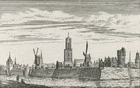 Skyline van Utrecht met de Dom en andere torens of kerken molens en de stadsmuur en stadswal tegen de gracht.