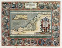 Kaart van het Heilige Land, omgeven door 22 medaillons met taferelen uit het leven en de dood van Abraham.