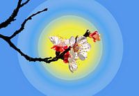 Tak met bloesems van een abrikozenboom tegen een blauwe lucht en gele zonneschijf