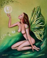 Dit nostalgische olieverfschilderij is niet alleen voor absintliefhebbers, maar moet u ook overtuigen van het bestaan van natuurgeesten en elfen. Het is 100% handgeschilderd en handgesigneerd!