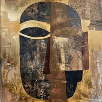 Dit abstracte kunstwerk toont een gestileerd gezicht in warme aardse tinten en subtiele gouden accenten. De compositie is opgebouwd uit geometrische vlakken en ruwe texturen, waardoor het werk een krachtige, bijna sculpturale uitstraling krijgt. De vorm van het masker roept een gevoel van tribal kunst en mystiek op, terwijl de moderne abstracte stijl zorgt voor een eigentijds karakter.