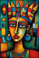 Dit abstracte Afrikaanse kubistische schilderij toont het portret van een vrouw, haar gezicht opnieuw verbeeld door middel van gedurfde geometrie en ritmische fragmentatie. Vlakken, vormen en kruisende hoeken breken haar gelaatstrekken in een dynamische compositie die zowel modern als tijdloos aanvoelt. De kubistische stijl verandert haar portret in meer dan een gelijkenis - het wordt een vormentaal, waarin scherpe randen en verzachte vlakken in harmonie samengaan. Schilderachtige texturen voegen diepte en beweging toe, terwijl de structurele balans van de compositie kracht, gratie en culturele rijkdom uitstraalt. Het resultaat is een portret dat levend aanvoelt, waarbij elke hoek nieuwe perspectieven van identiteit en expressie onthult.
