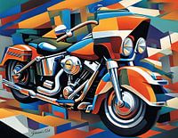 Een levendig gekleurde motorfiets is afgebeeld in een geometrische, abstracte stijl met scherpe hoeken en contrasterende tinten. De achtergrond bestaat uit gefragmenteerde vormen en kleuren die het ontwerp van de motorfiets aanvullen.