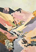 Een schilderij van de vallei, met pastelkleuren en vormen. De bergen vormen een abstracte vorm in zachte tinten roze, geel, lavendel, groen, bruin en zwart.