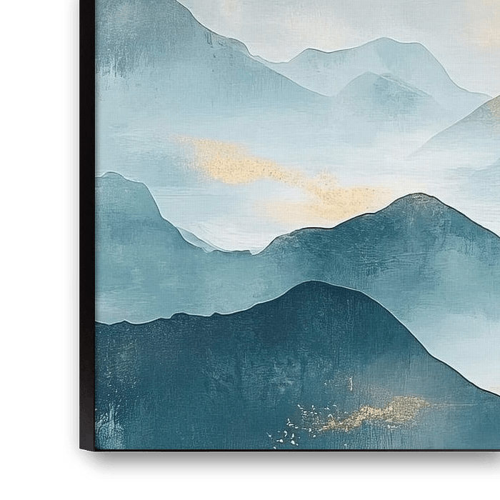 Details: abstract schilderij, berglandschap, moderne kunst, textuur, diepte, abstracte natuur, gouden accenten, laagjes, serene kunst, artistiek landschap