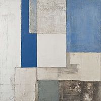Abstract Blauw | Crumbling Elegance - Dit abstracte schilderij kenmerkt zich door een compositie van geometrische blokken in blauwe en witte tinten, verrijkt met subtiele texturen en verweerde effecten die diepte en geschiedenis suggereren.