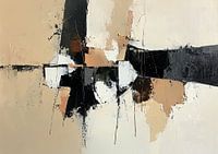 Abstract Contrast | Beige en Zwart Samenspel - Dit abstracte schilderij kenmerkt zich door een samenspel van beige, zwart en witte kleurvelden, doorsneden door krachtige zwarte lijnen die een dynamisch evenwicht suggereren en een rustgevende symmetrie creëren.