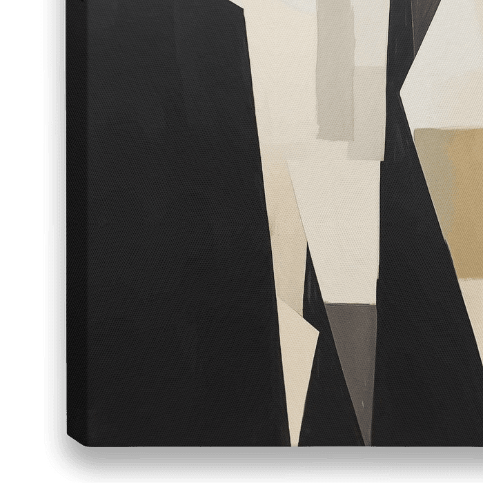 Twee gestileerde figuren in een abstracte vorm, met een sterke invloed van kubisme. De monochrome kleurkeuze, met witte en beige tinten op een donkere achtergrond, zorgt voor een sterk contrast en legt de nadruk op de geometrische vormen die de figuren vormen.