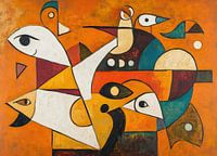 Details: abstract schilderij, dieren, geometrie, oranje, zwart, wit, bruin, geel, speelse, gezichten