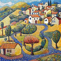 Abstract Dorpslandschap - Dit is een abstract schilderij dat een kleurrijk en gestileerd dorp in een heuvelachtig landschap presenteert, opgebouwd uit kleine, levendige mozaïekachtige elementen.
