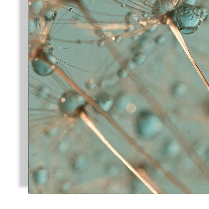 "Abstract: Druppeltjes rusten op een pluizenbol" is een macrofoto van waterdruppels op de pluisjes van een paardenbloem met een cyaan, groen, blauwe, turqouise achtergrond. De pluisjes van de paardenbloem zijn door het "gouden" licht ook goudachtig van kleur.