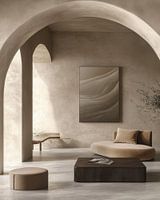 e illustratie combineert warme aardetinten en vloeiende vormen, die doen denken aan landschappen vanuit een abstract perspectief.