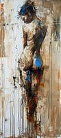 Abstract Figuratief | Blauwe Essentie - Dit schilderij verbeeldt een abstracte menselijke figuur, gevangen in een spanningsveld van textuur en kleur. De stijl is kenmerkend urban met een ruw paletmes effect en een subtiele figuratieve ondertoon. De dynamische combinatie van diepblauwe en aardse tonen creëert een fascinerende diepte waar…