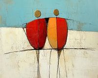 Abstract Figuren | Abstract Duo Gouden Hoofden - Dit abstracte schilderij toont twee gestileerde, langwerpige figuren in rood en oranje, beide met een gouden cirkel als hoofd, tegen een lichtblauwe en witte achtergrond, wat een rustgevend en harmonieus gevoel geeft.
