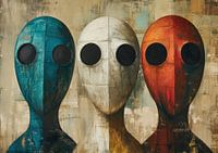 Abstract Figuren Schilderij - Dit abstracte figuren schilderij portretteert drie gestileerde, maskerachtige figuren, elk met een prominente ovale vorm en grote zwarte cirkels voor ogen, wat een buitenaardse indruk geeft. De linkerfiguur is gedrenkt in diepe blauwtinten, gevarieerd met subtiele groene toetsen, waardoor een mysterieus en…