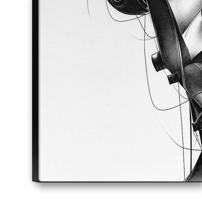 De keuze voor zwart-wit benadrukt de tijdloze elegantie en de strakke vormen van het futuristische tafereel. Het hoofd lijkt te zweven tussen realiteit en abstractie, waarbij de koptelefoon fungeert als een brug naar een kosmische symfonie die alleen hoorbaar is in de verbeelding.