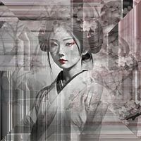 Stap binnen in een wereld waar realiteit vervloeit tot een betoverend schouwspel van kleur en vorm, waar een geisha zich bevindt te midden van roze kersenbloesems in een abstracte compositie.