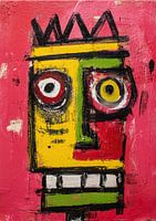 Abstract Gelaat - Dit abstract schilderij toont een kleurrijk gezicht met grote, expressieve ogen in een combinatie van geel, groen, en rood op een levendige roze achtergrond.