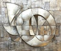 Abstract Geometrisch | Melodic Geometry Flow - Dit abstracte schilderij toont een complexe compositie van ineengrijpende geometrische vormen, waaronder cirkels en vierkanten die grijze en beige tinten combineren met een subtiele textuur die diepte en dynamiek toevoegt.