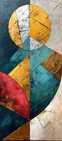 Abstract Goudaccent | Gouden Snede - Dit abstracte werk maakt een krachtige indruk door het gebruik van geometrische vormen en texturen, gecombineerd met een dynamisch palet van blauw, goud en rood tegen een neutrale achtergrond. De schildertechniek met zijn diepe groeven en krassen draagt bij aan het levendige karakter en de tactiele…