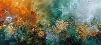 Abstract Goudaccent | Overgang - Hier zie je een dynamisch abstract kunstwerk dat een rijke textuur vertoont en complexe patronen die organische vormen suggereren. De overgang van warme, roestachtige tinten naar sereen blauw groen creëert een betoverende diepte, verlevendigd door gouden accenten die een luxueuze uitstraling geven.