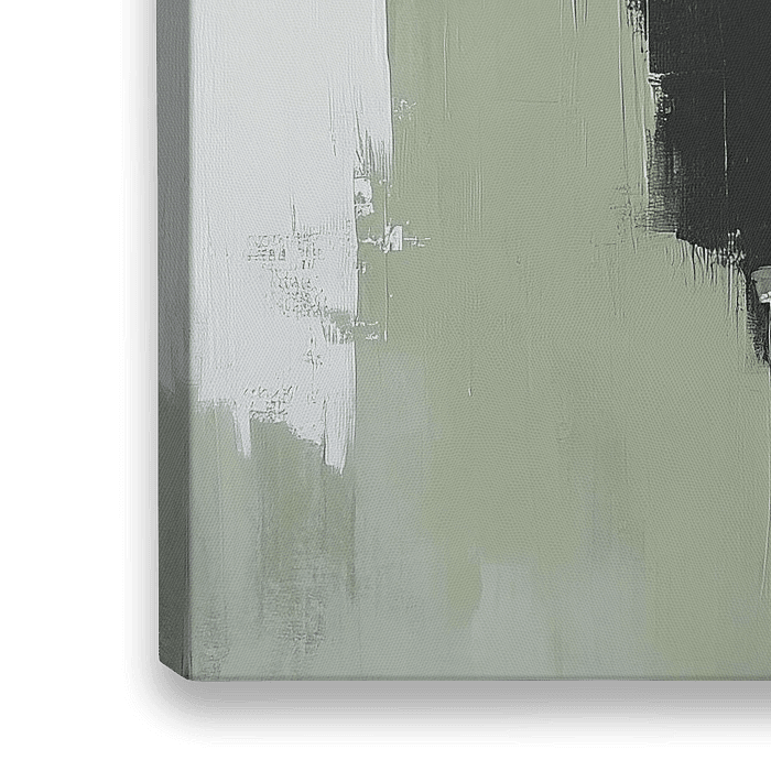 Abstract Groen | Echoes of Subdued Contrast - Dit abstracte schilderij bestaat uit overlappende geometrische vormen in gedempte groen- en taupekleuren met een dramatisch, centraal zwart vlak dat contrast biedt.