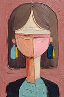 Een modern impasto schilderwerk dat een abstracte portretweergave toont in een verfrissend kleurenpalet. Het gezicht is in twee delen gesplitst, weergegeven in zachte roze en perziktinten, omlijst door donker haar en geaccentueerd met turquoise en gele details. De dikke verflagen creëren een krachtige textuur die de emotionele diepte van het werk versterkt.