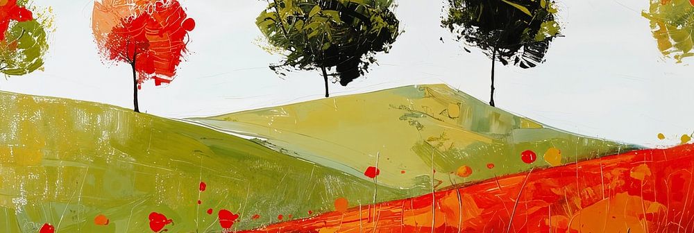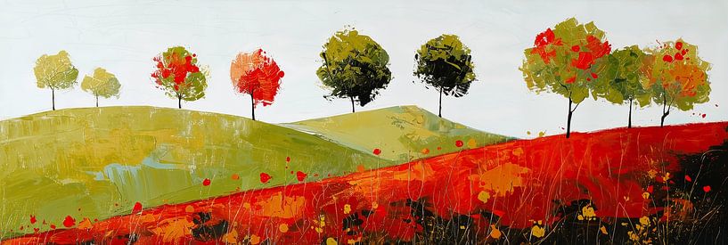 Details: abstract, landschap, natuur, bomen, heuvels, modern, kleurrijk, velden, herfst, kunst