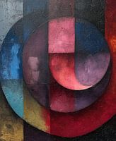 Kleurrijk abstract kubisme met kleurvlakken en cirkels in een gelaagd 3d effect met een grove textuur.