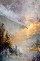 Dit gouden abstracte landschap met nevelige tinten en zachte herfstkleuren voelt dromerig en elegant aan. Het brengt een gevoel van rust en warme diepte in je interieur. Mooi passend in Scandinavische, Japandi, Modern Chic en Wabi-Sabi interieurs en een bijzondere toevoeging voor woonkamer, eetkamer, hal of slaapkamer.