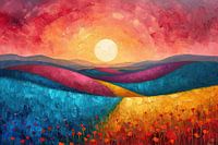 Abstract Landschap Kleurrijk | Blaze Horizon - Kleurrijk abstract landschap met zonsopgang en bloemenveld