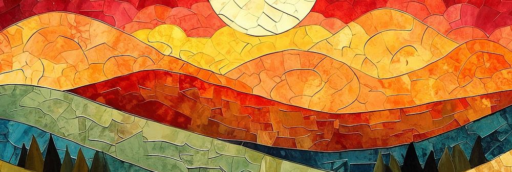 Details: landschap, abstract, mozaïek, maan, heuvels, water, bomen, kleurrijk, rood, geel
