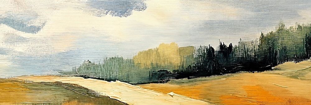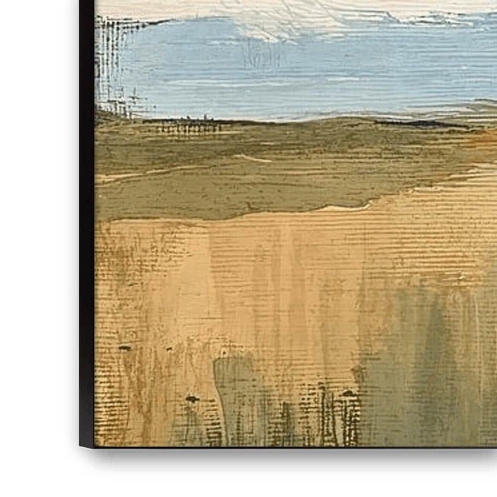 Abstract Landschap | Sky Mingle - Dit landschap schilderij toont een uitgestrekte open vlakte met glooiende heuvels en een dichtere verzameling bomen in de verte, benadrukt door een dynamische lucht van zwevende wolken in pastelkleuren, waarbij de aardetinten van de ondergrond harmonieus samensmelten met de zachte luchttinten.
