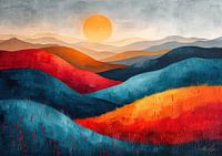 Details: zonsondergang, bergen, abstract, modern, landschap, rood, blauw, oranje, geel, wit