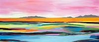 Kleurrijk abstract landschap met voornamelijk blauw,oranje,groen en roze tinten.