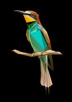 Abstracte low poly Europese bijeneter in abstracte low poly illustratiestijl. Ik wil dieren op een andere manier beschrijven. Dieren in abstracte kunststijl, abstracte illustratie. Europese bijeneter vogel op tak met zwarte achtergrond.