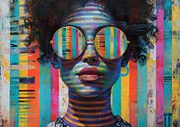 Details: vrouw, portret, bril, kleurrijk, modern, pop art, gezicht, krullen, kunst, reflectie