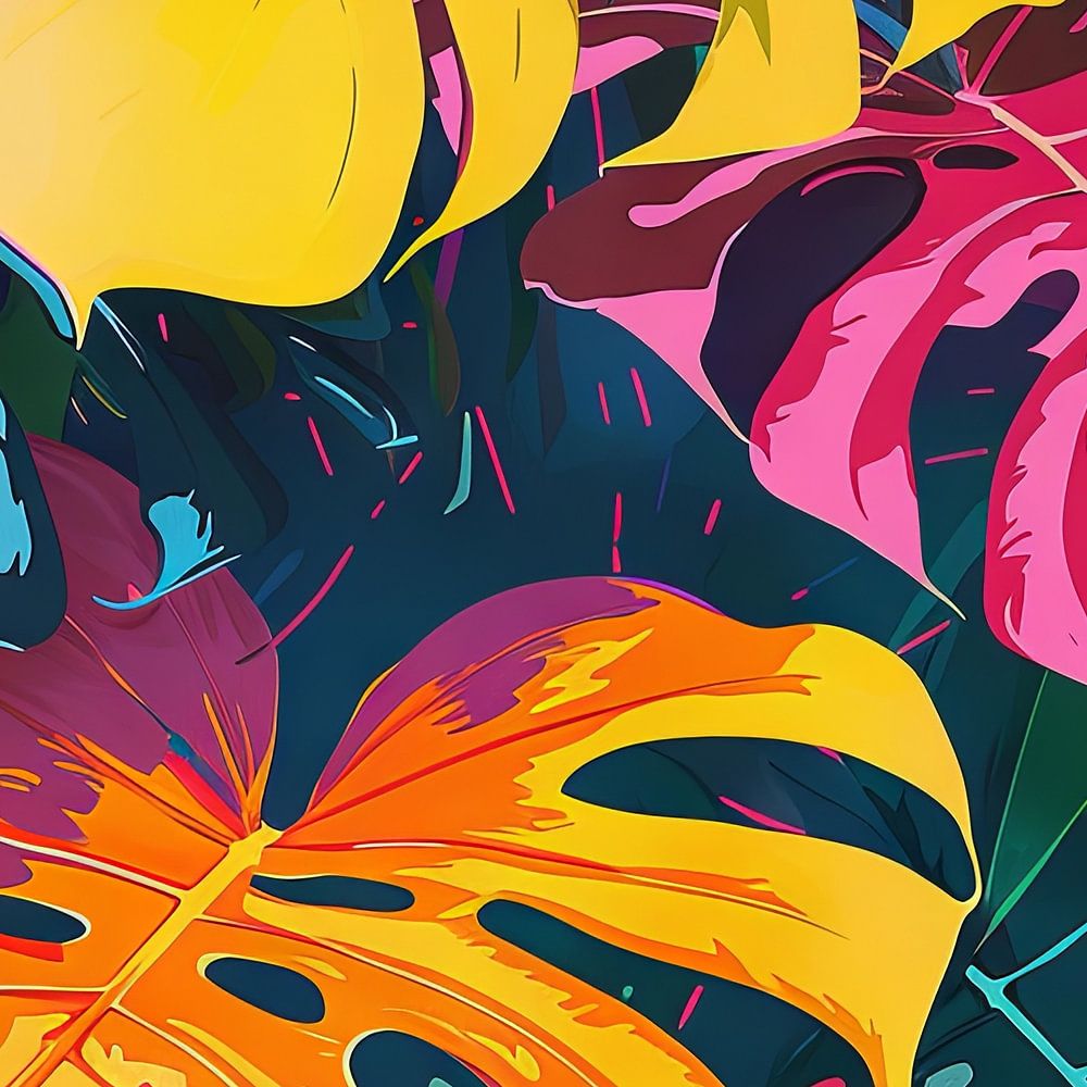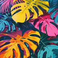 Deze kunstdruk toont monsterabladeren in een abstracte en kleurrijke compositie. De levendige roze, oranje en blauwe tinten geven het kunstwerk energie en creativiteit. De dynamische opstelling van de bladeren en het kundige gebruik van kleuren en texturen geven deze print een expressieve en moderne uitstraling. Dit ontwerp is ideaal voor residentiële of commerciële ruimtes die op zoek zijn naar een gedurfd accent en zal iedereen aanspreken die houdt van een artistieke en levendige sfeer in hun omgeving.